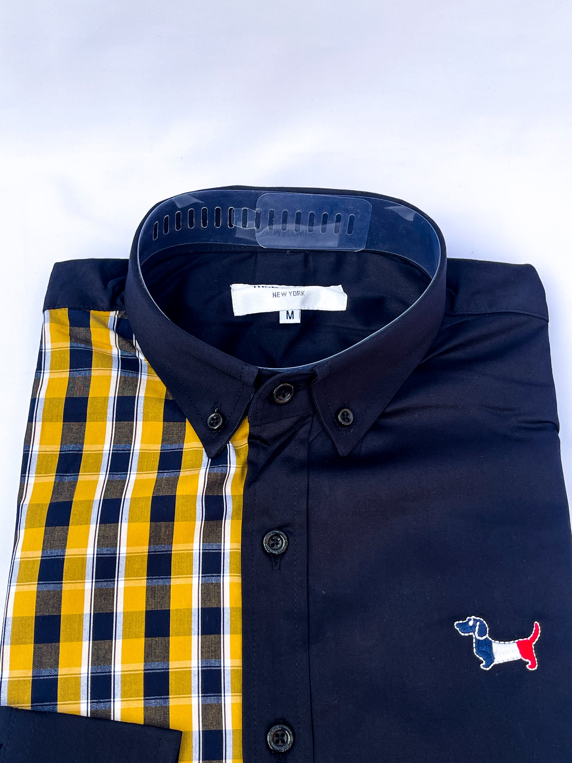 This TB shirt redefines contemporary luxury with a unique split design. With a half-and-half, it features a solid plain color on one side and a bold checkered on the other.
